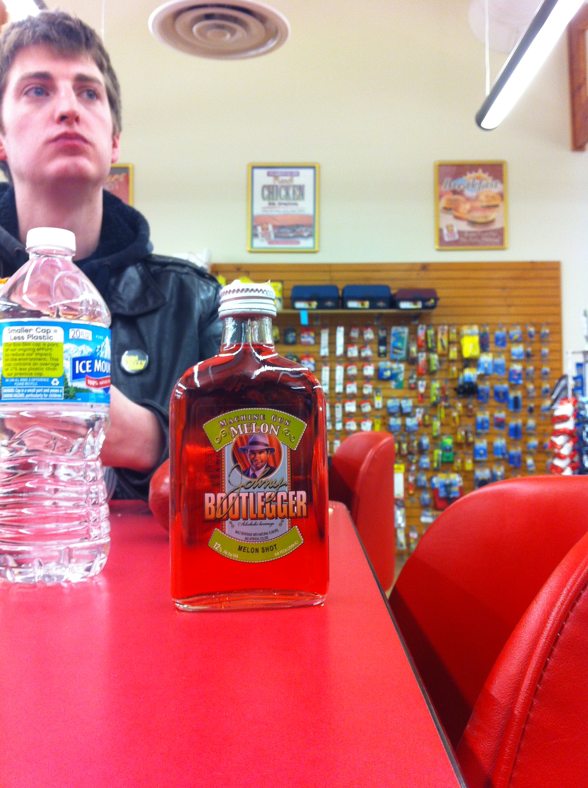 turned out to be pretty nice guy. Andy bought a meatball sub from some overly tan pizza clerk of undetermined age (15 or 50) while I ate an apple and drank some water due to a stomach ache. I also grabbed some Nyquil so that if i died on the trip, i would be blacked out and would have something useful to pass to people to consume during my funeral. i also bought some bum wine because the shit was called MACHINE GUN MELON and some fuses to try and fix the cigarette lighter so we werent listening to The Electric Prunes for 30 hours. the woman at the counter had high gums and an outdated sense of fashion and made flirty jokes about being old.