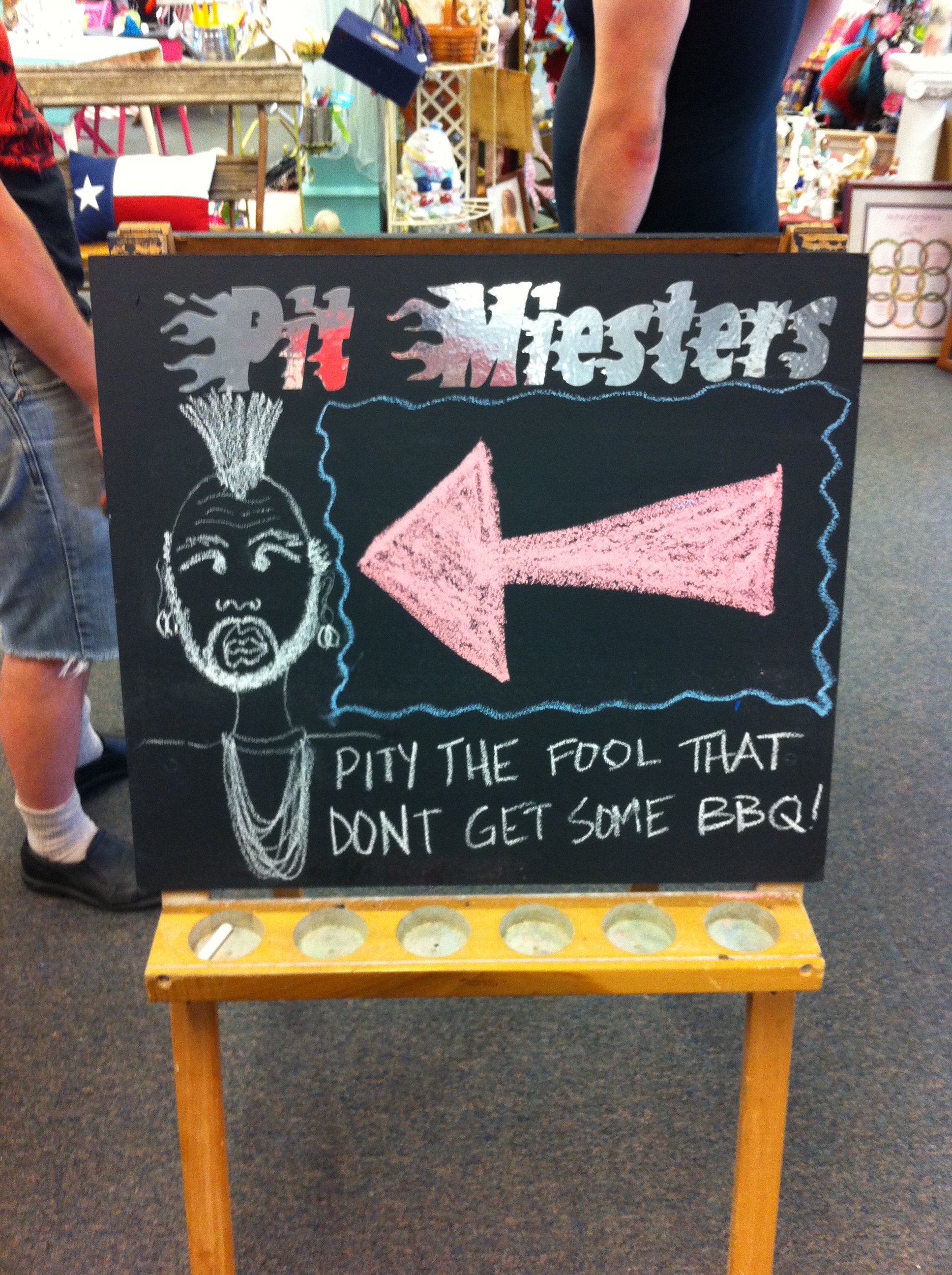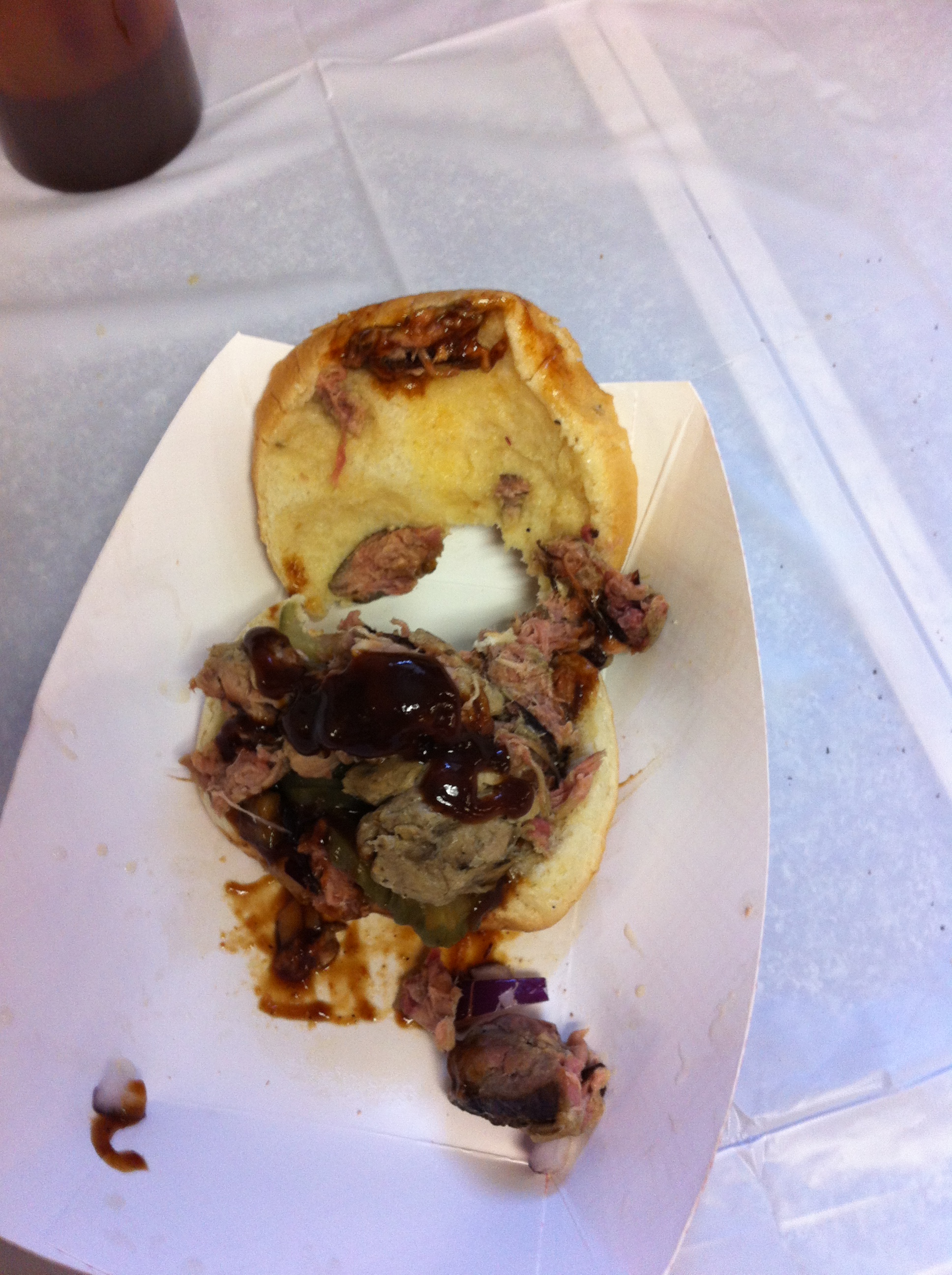 but there was something worthwhile at this flea market. the promise of barbequed meat. after roaming around the old people bullshit, i finally asked someone at the counter where it was and they directed me upstairs with the warning that it was closing soon. so dan and i darted up the stairs and were greeted by a sign in the front of a very large, open room with people milling about, probably looking at more old people bullshit. but to the left of the sign, there was a small kitchen and a table with various fixings for sandwiches.