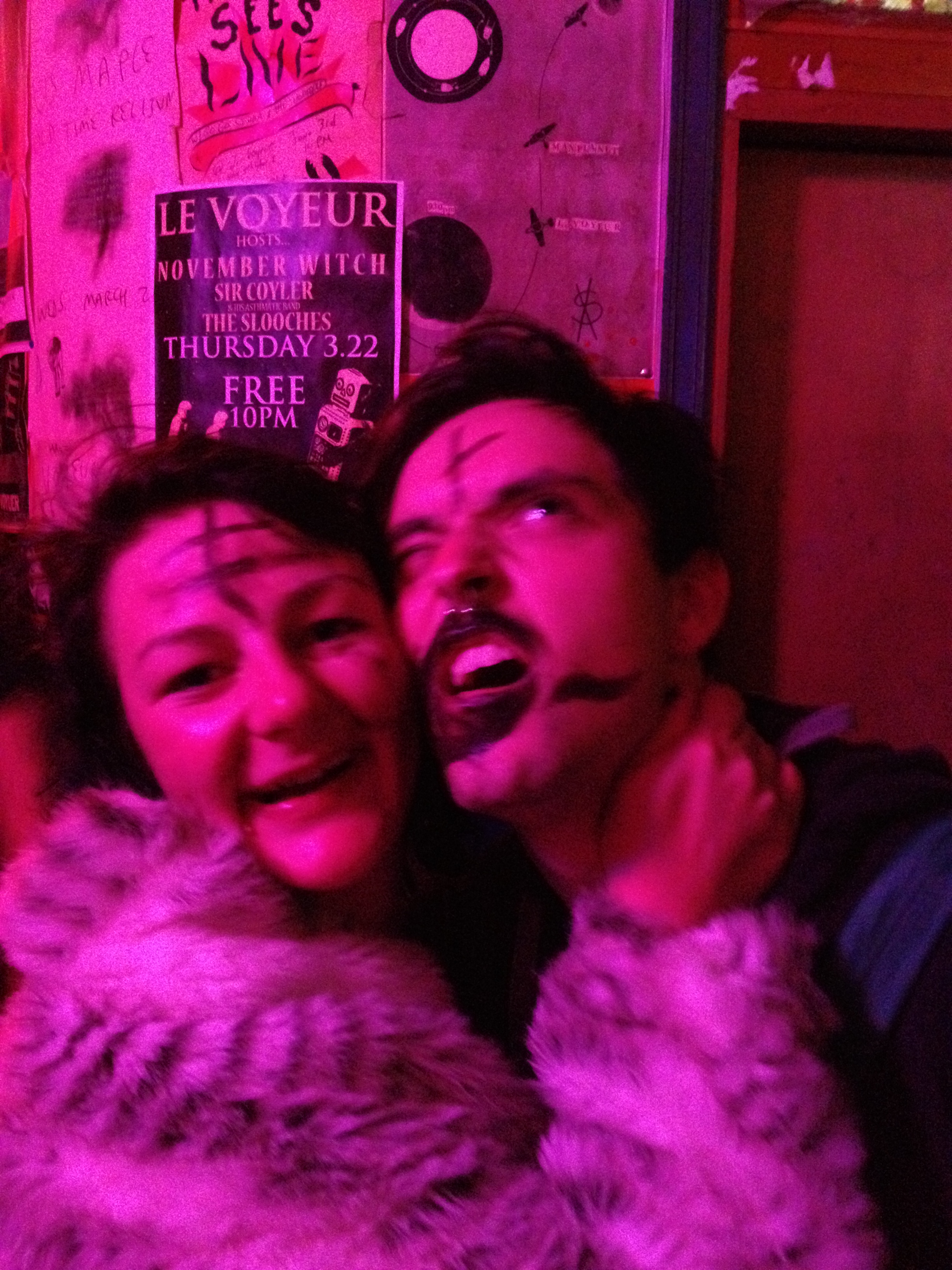 when we got to Le Voyeur, we noticed there was another show going on in the back room. the show board was pretty vague as far as what was going on but it was clear that there was an early “rock n roll” show and a late “hardcore punk” show. i went in the back room and there were some people picking shit up and unloading in the back alley, having just played. we talked for a while and realized we had nothing in common.
