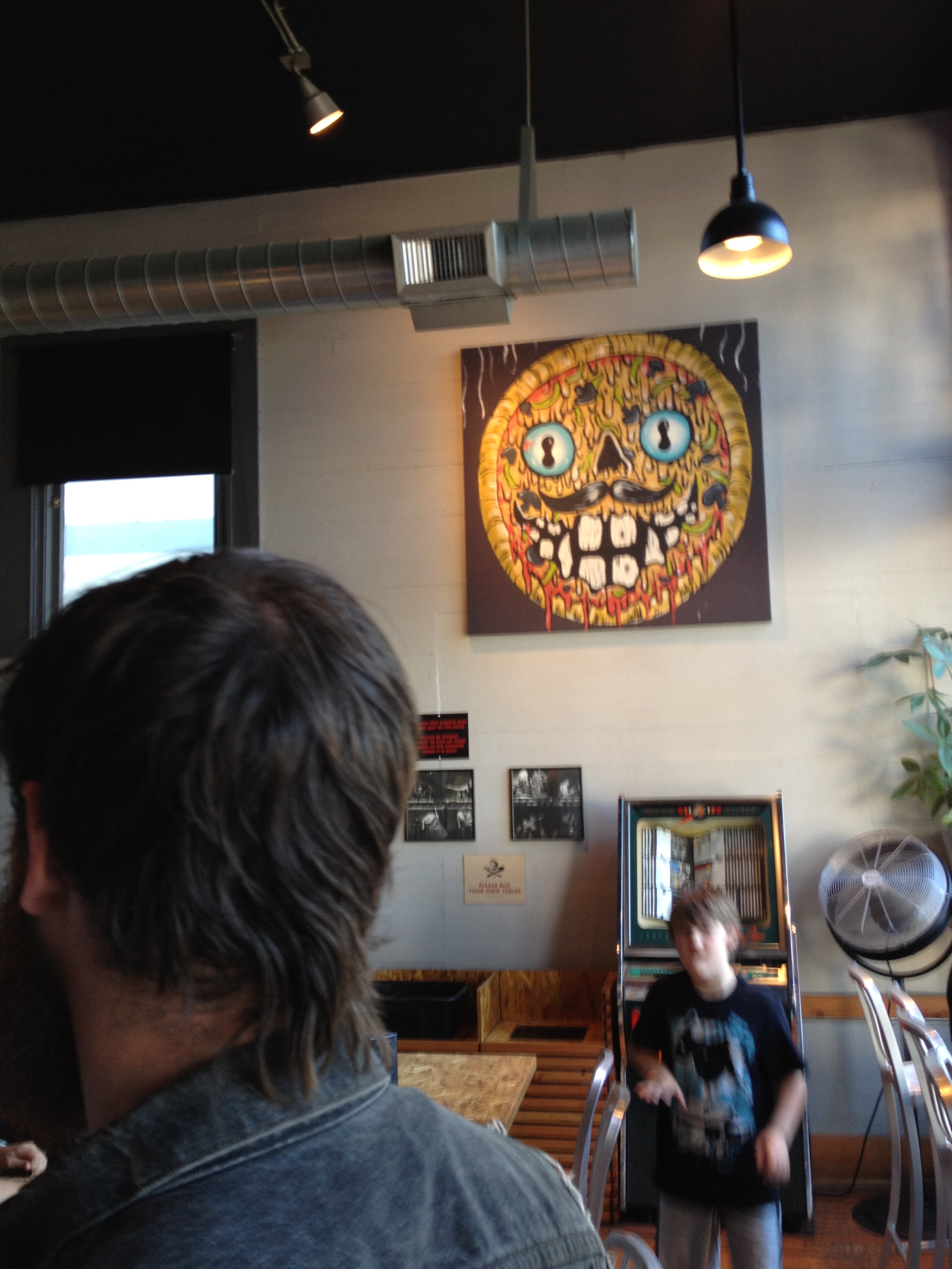 then we went to Sizzle Pie, a pizza place that has Hawkwind, Karp, Don Caballero, and other ALT-PUNK-GOTH titled menu items. it was good. then we went to a barcade called Ground Control where we played a shitload of pinball while one of those fucking kids with white gauges and short hair played all sorts of “deathcore”, which is music for 14 year old girls who don’t know or care about death metal. i also armwrestled Sam there and won, proving i am the superior punk frontman.
