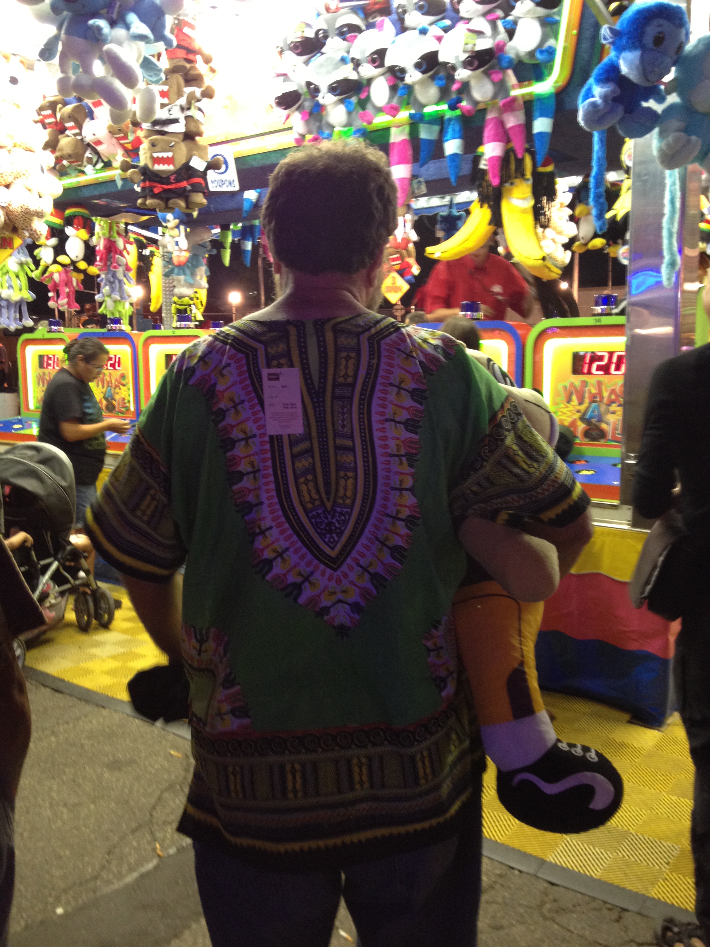 then we sold a bunch of shit. then i dont know what happened, but i am certain we were paid well and taken care of because Omaha is a fantastic place. the next pictures i have are me at the Minnesota State Fair two days later. it was not the best time i have had at the fair because some dude groped my girlfriend (i was not nearby and wisely dragged away from the guy upon finding out) and later i watched another guy dude with neck tattoos grab his girlfriend by the hair and pull her down, then chase her as she ran away. we tried following the dude without being noticed but it was sketchy shit. but on the plus side, i got a picture of this white guy wearing a dashiki. note the tag.